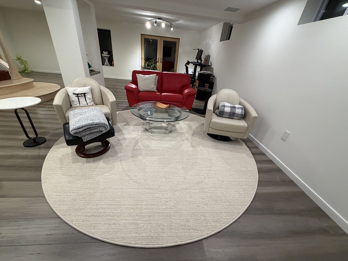 We recently ordered the Calamus Cream wool carpet in a 10’ round design for our entertainment room. It worked well with our grey hardwood floor, red sofa, and beige easy chairs. It looks beautiful, feels very plush to walk on (we ordered it with padd...